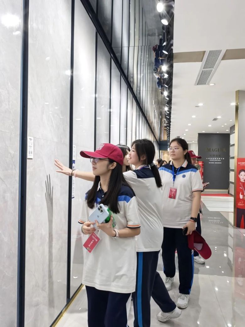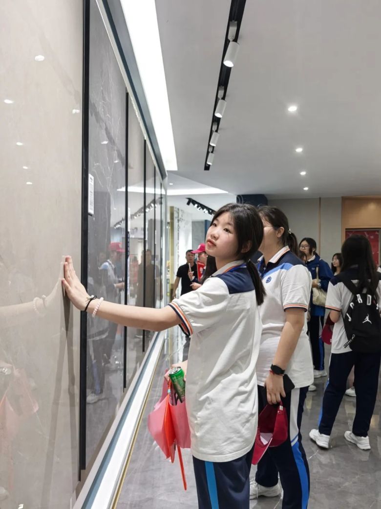 在工作人员的带领下,他们触摸着岩板细腻的纹理,观察着肌肤釉的纹理变化,惊叹于一片瓷砖如何通过设计、工艺与科技的融合,化身空间艺术的灵魂。