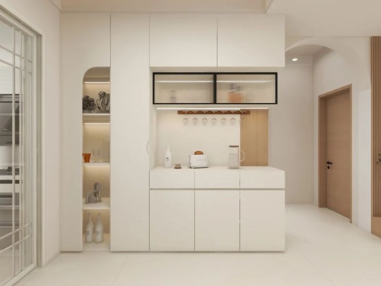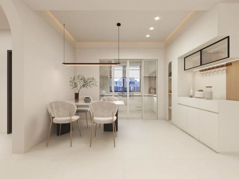 餐厅一侧做到顶餐边柜,中间按留空作为结合水吧区,功能更丰满好用。装灯带后更显高级,为餐厅增添了一份精致感。