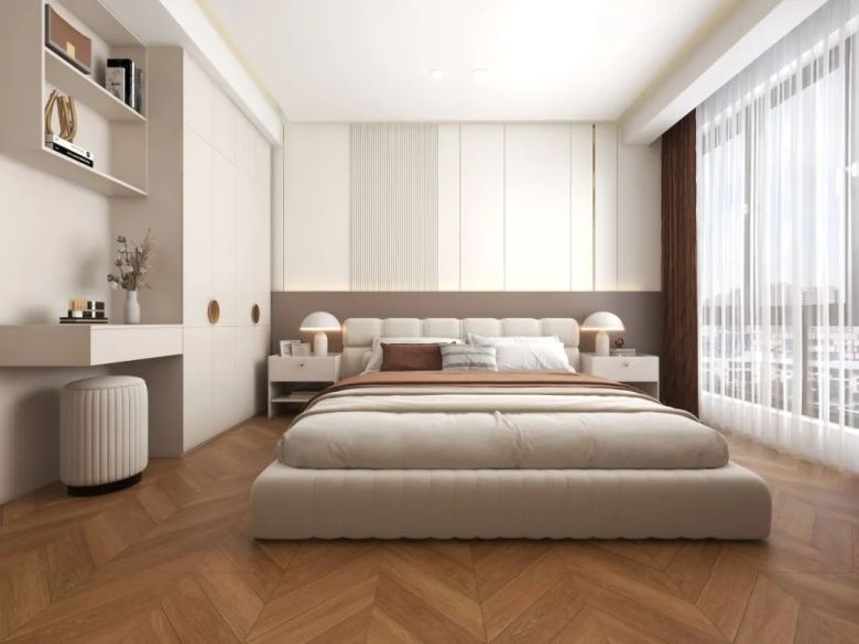 主卧在奶油色的空间基础,布置奶油色的床铺、床单与窗帘,在简洁的空间下,为主人提供了一个轻松舒适的休息睡眠空间。床头背景墙使用木饰面和带有线条设计的护墙板,配合灯带营造氛围感。地面铺贴的斯米克马来柚木,为空间增添了动感和节奏感,还让空间显得更加立体和生动。鱼骨形的排列方式在视觉上产生了一种向前的延伸感,使得卧室显得更加宽敞。