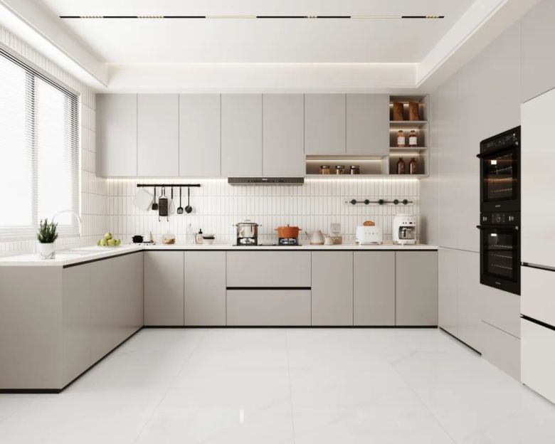 暖灰色的满墙定制柜、卧室背景墙、见光板