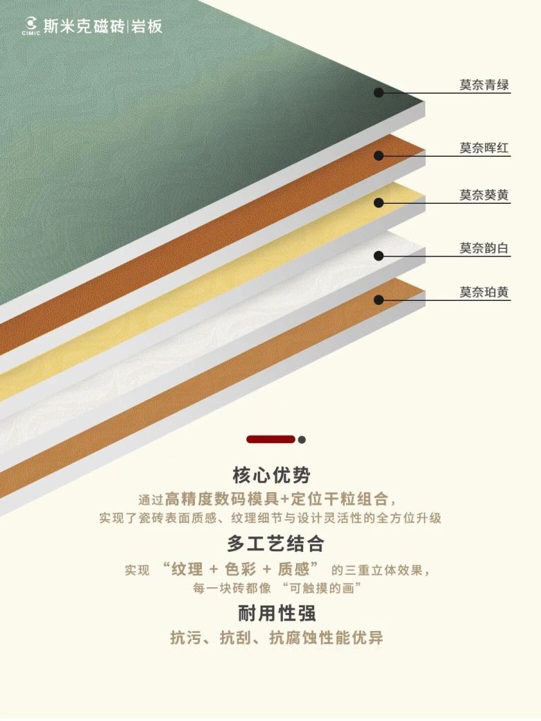 ▪️核心优势:通过高精度数码模具+定位干粒组合,实现了瓷砖表面质感、纹理细节与设计灵活性的全方位升级