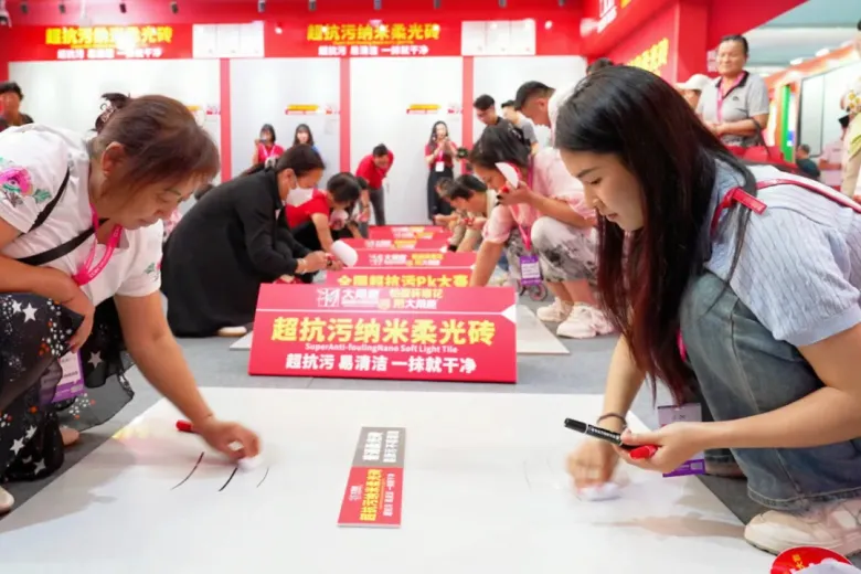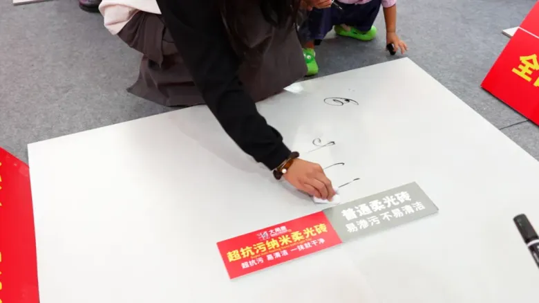 “超抗污,易清洁,一抹就干净”,为了更直观地展示大角鹿超抗污纳米柔光砖的硬核品质,大角鹿还在展会现场举办了“大角鹿超抗污PK大赛”。现场邀请了来自五湖四海的经销商、业界同行及广大消费者共同参与,亲身实测大角鹿超抗污纳米柔光砖优秀的抗污性能。