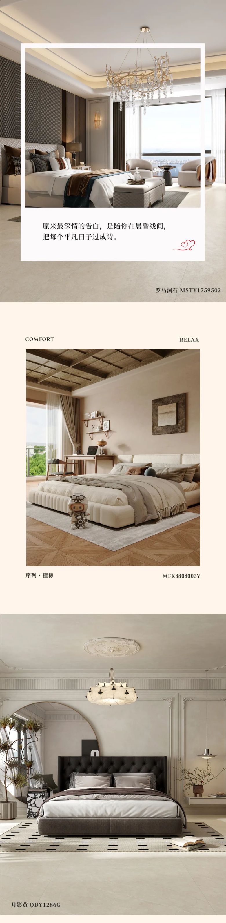 卧室是心灵的秘境,舒适与静谧缺一不可。低饱和度色彩经纹理渲显技术细腻调配,结合温润触感釉面,赤足踏上的那一刻,疲惫顷刻消散。高温数控技术保障砖体稳定,静音特性大幅降低夜间声响,为相爱的人营造更包容的共享空间,让心靠得更近,让爱沉淀得更深