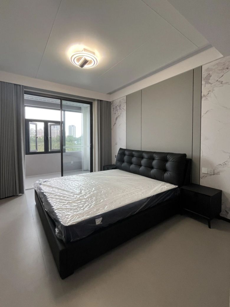 · 黑色皮质床头沉稳大气与素净背景墙构筑安宁休憩场景