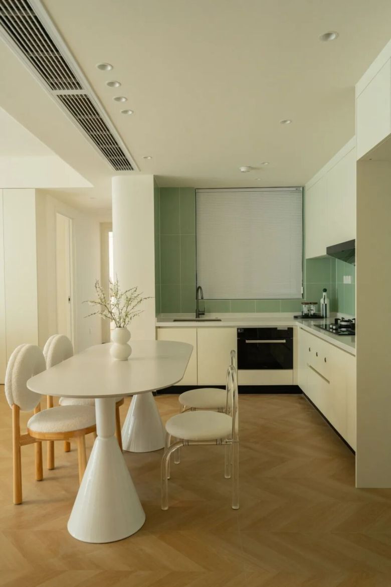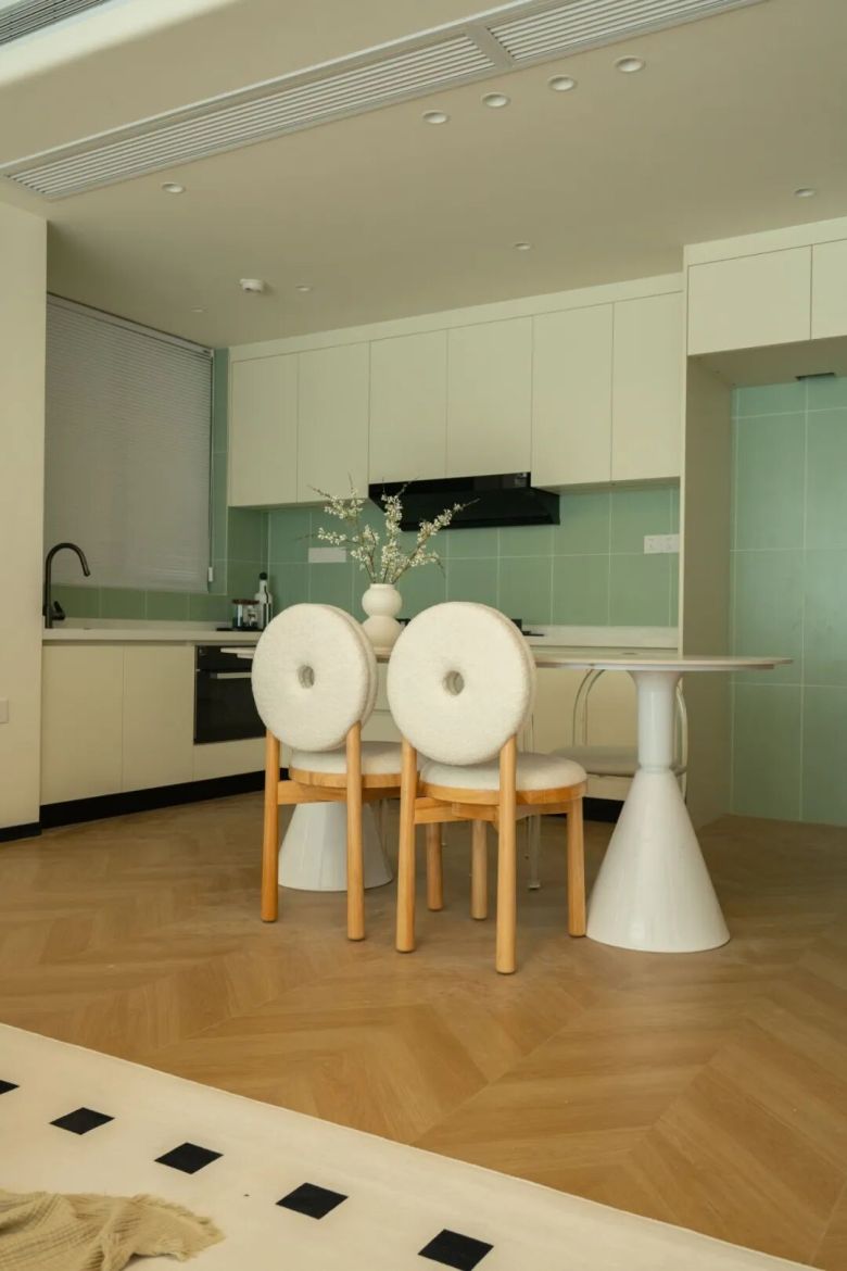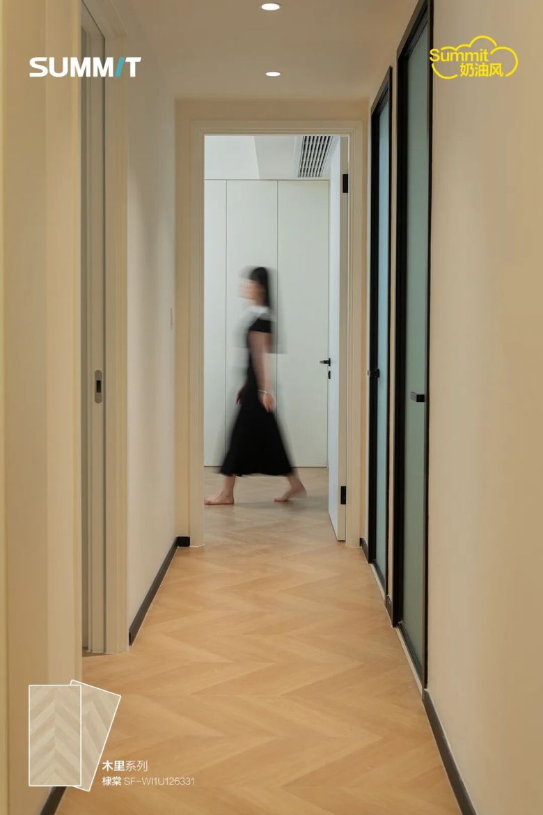 鱼骨拼的走向引导视线延伸,在卧室营造出静谧复古的休憩氛围,在公共区域则强化了整体动线的流畅性。