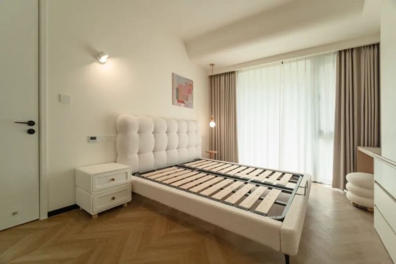 软装设计师以“ 7:2:1 ”的配色法则,执笔这个家的情绪底色——70%奶油白与原木色如呼吸般舒展,20%的中性色轻轻收束视线,最后10%用艺术摆件悄悄提亮,像诗句中的韵脚,细腻却不喧哗。沙发与床品如云朵般蓬软,羊羔绒与短绒材质也回应着屋主对“触觉安全感”的执着。