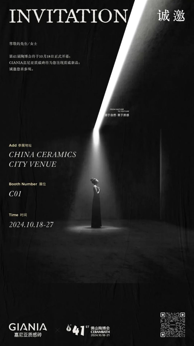 10月18-21日,2024年第41届佛山陶博会即将盛大启幕!嘉尼亚重磅推出多个系列数十款新品,产品规格涵盖1200×1200mm、900×1800mm、750×1500mm、600×1200mm, 诚邀全球客商莅临参观与品鉴!