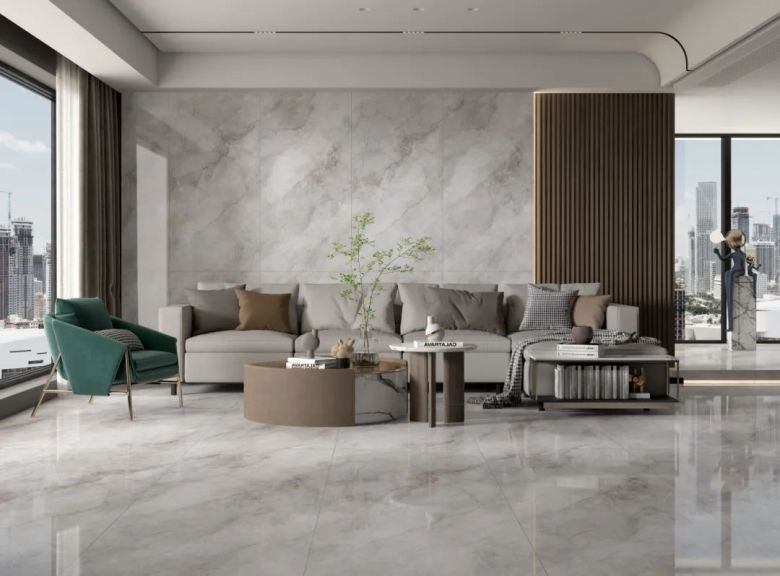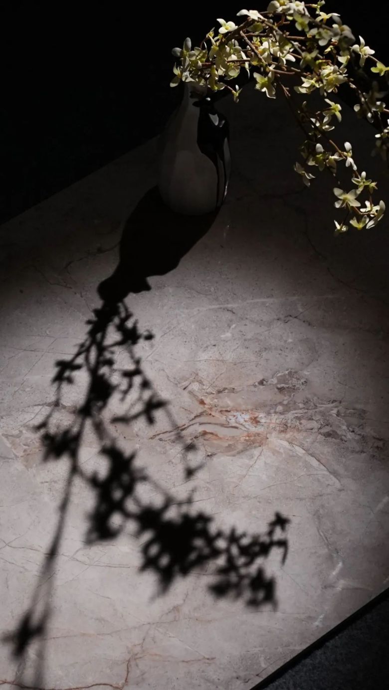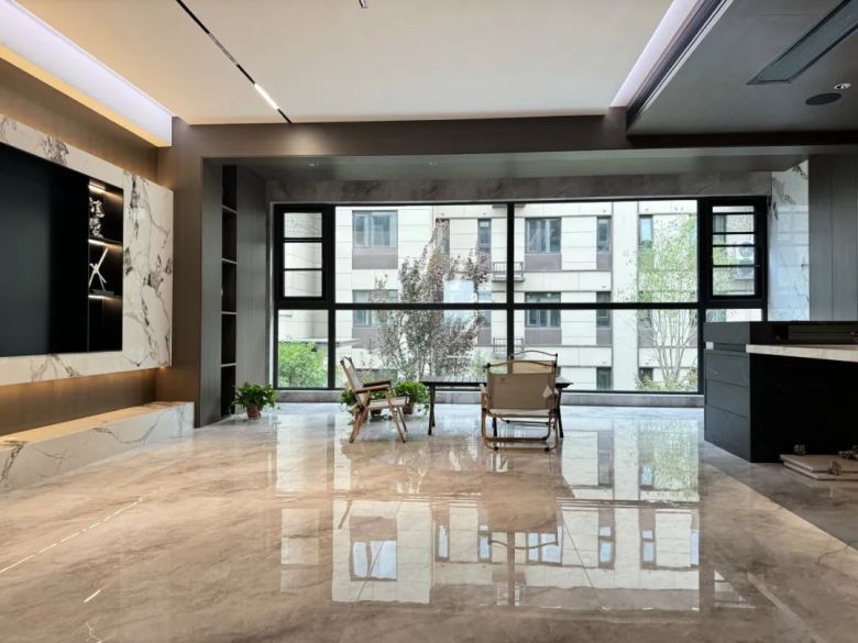 自此,这份自然界的完美,摆脱“孤本”的束缚,融入寻常烟火之家。于客厅,地面延展如原石剖面的山河画卷。纹理起伏似山,色韵流动如水,赋予空间沉静而磅礴的底蕴。