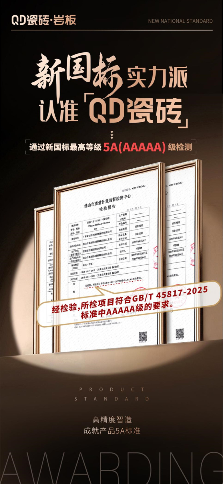 近日,QD瓷砖核心产品正式通过国家《消费品质量分级陶瓷砖》(GB/T 45817-2025)5A级最高质量等级检测。
