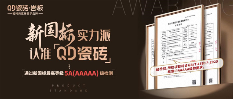 作为新国标“实力派”代表,QD瓷砖凭借高精尖技术、高韧性体系、高精度生产制度,成功跻身行业“5A品质认证”企业阵营。更标志着QD瓷砖在技术、体系、标准协同驱动的高质量发展道路上进入了全新阶段,立于行业品质新高地。