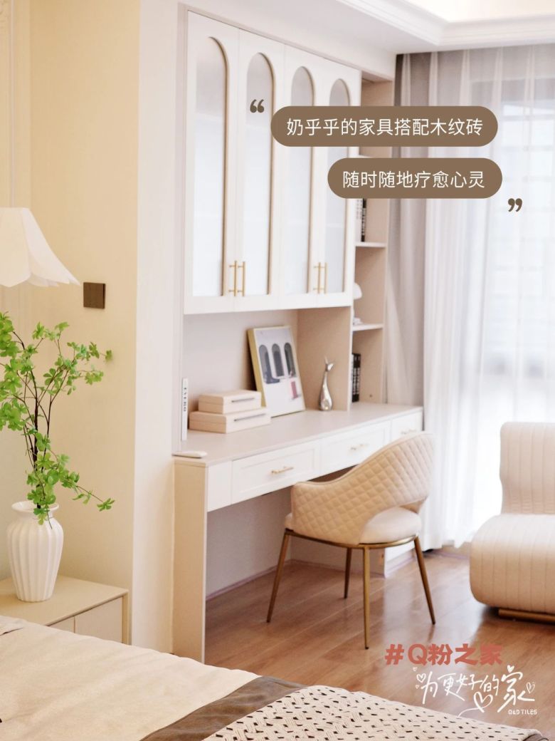 想轻松将房间的氛围感拉满,家居也多花心思,柜体定制了奶乎乎的弧形柜体、金属细节点缀,既有法式的慵懒浪漫,又有轻奢的精致感。