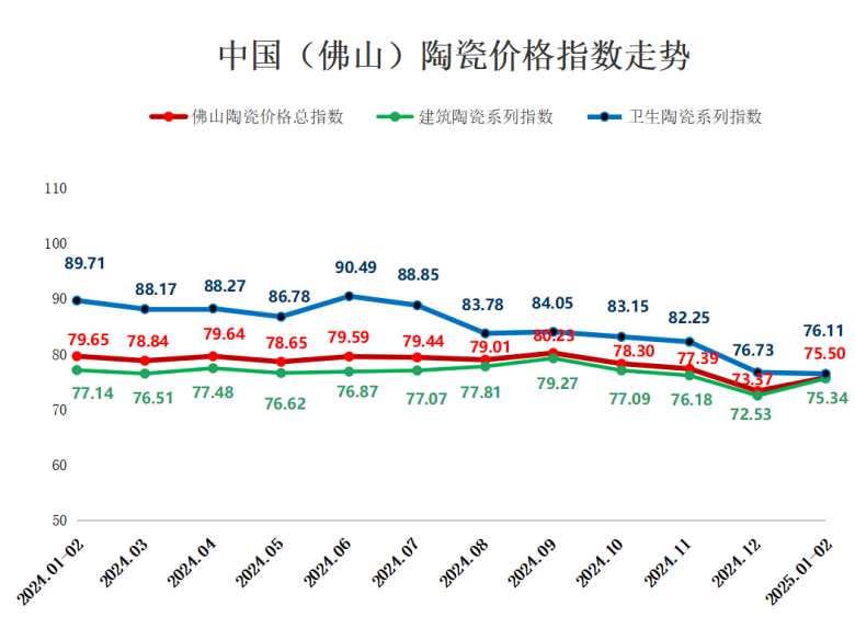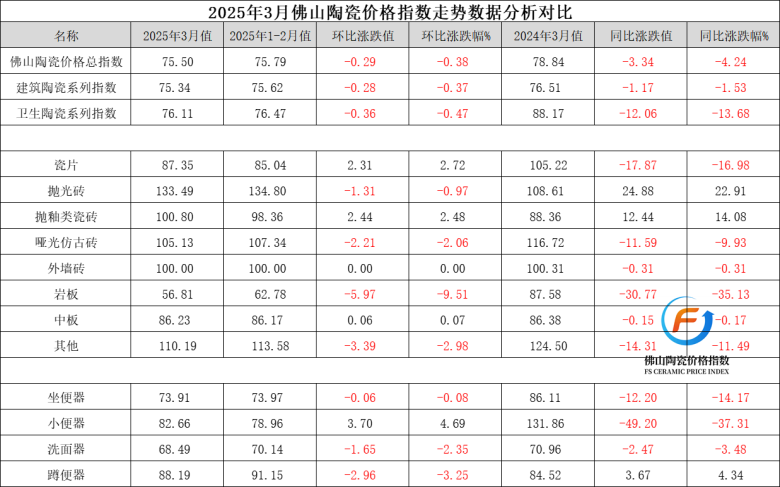 据“中国(佛山)陶瓷价格指数”信息系统监测显示,2025年3月佛山陶瓷价格总指数报75.50点,环比跌0.29,环比跌幅0.38%,同比跌3.34,同比跌幅4.24%;建筑陶瓷系列指数报75.34点,环比跌0.28,环比跌幅0.37%,同比跌1.17,同比跌幅1.53%;卫生陶瓷系列指数报76.11点,环比跌0.36,环比跌幅0.47%,同比跌12.06,同比跌幅13.68%。