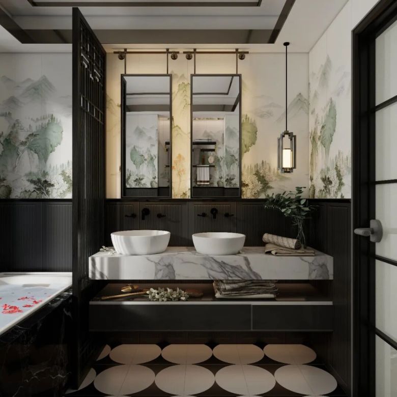 融入青花、水墨等经典意象,通过色彩淡化、线条简化等方式,使传统元素更适配现代空间。