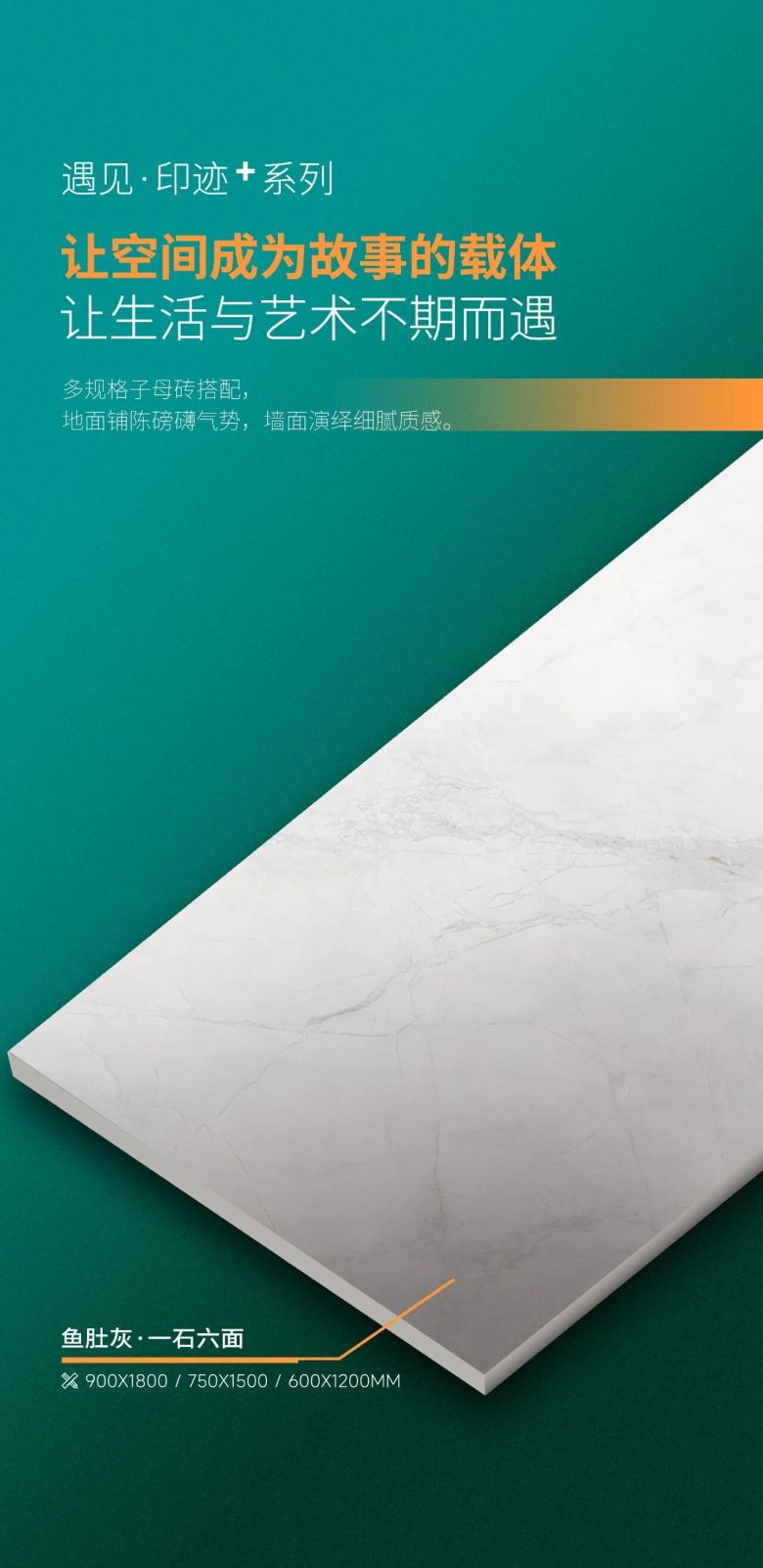 「遇见·印迹+」系列,以自然为灵感,以匠心为笔触,在900×1800mm的辽阔、750×1500mm的舒展、600×1200mm的精致中,让空间成为故事的载体,让生活与艺术不期而遇。