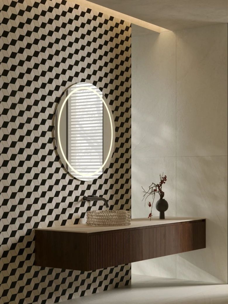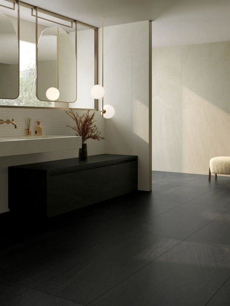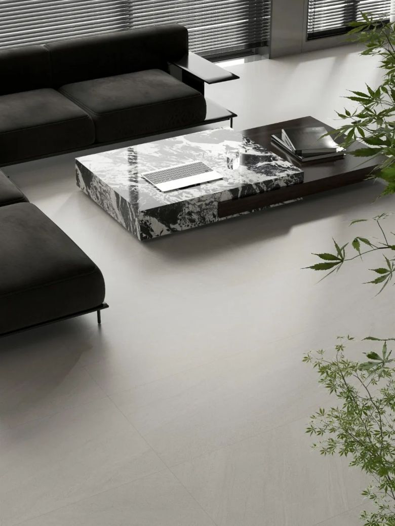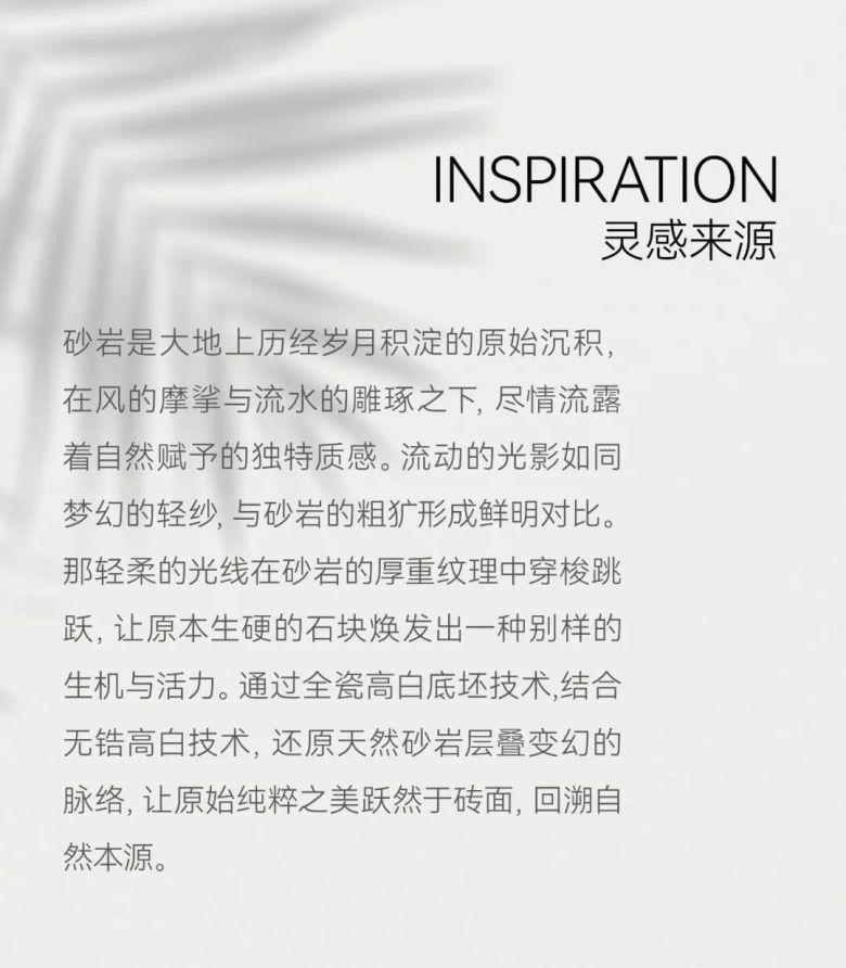 砂岩是大地上历经岁月积淀的原始沉积,在风的摩挲与流水的雕琢之下,尽情流露着自然赋予的独特质感。流动的光影如同梦幻的轻纱,与砂岩的粗犷形成鲜明对比。那轻柔的光线在砂岩的厚重纹理中穿梭跳跃,让原本生硬的石块焕发出一种别样的生机与活力。通过全瓷高白底坯技术,结合无锆高白技术,还原天然砂岩层叠变幻的脉络,让原始纯粹之美跃然于砖面,回溯自然本源。