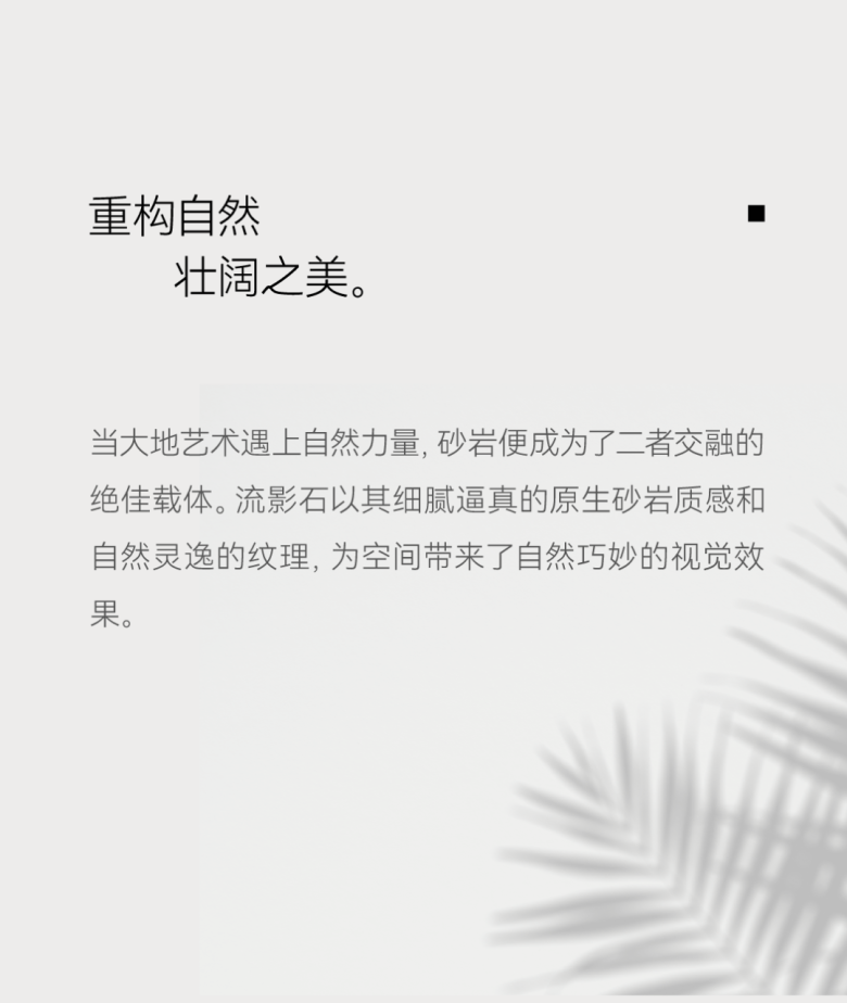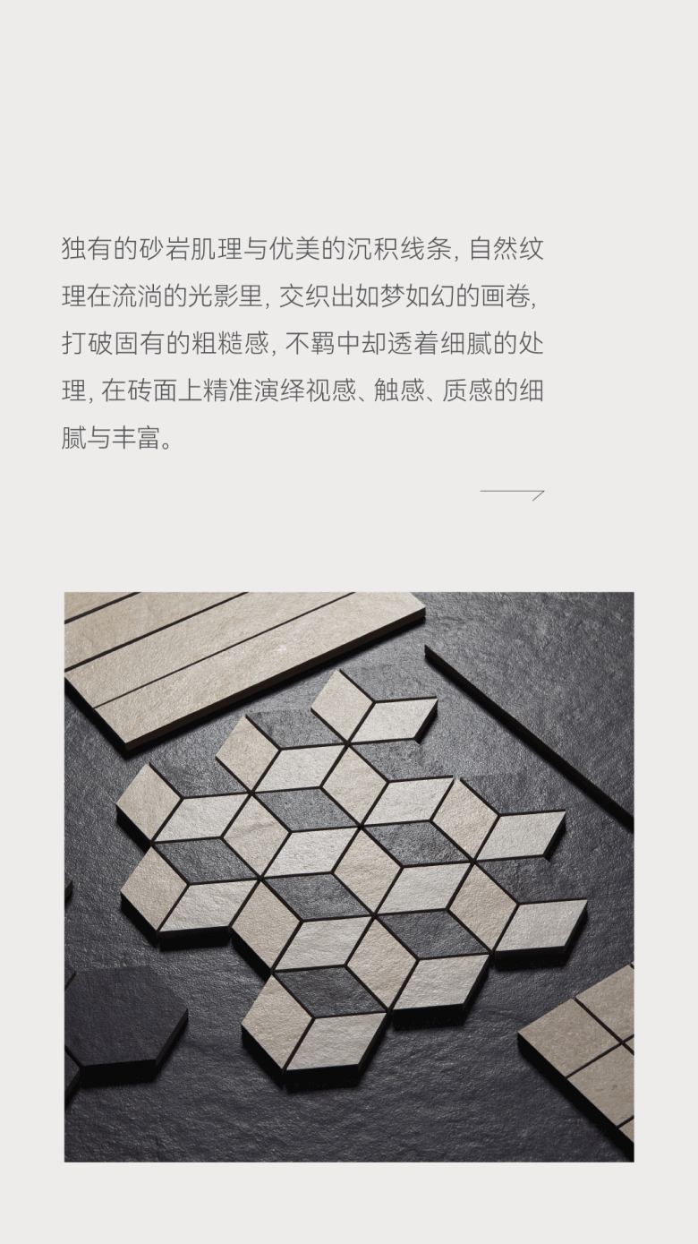 独有的砂岩肌理与优美的沉积线条,自然纹理在流淌的光影里,交织出如梦如幻的画卷,打破固有的粗糙感,不羁中却透着细腻的处理,在砖面上精准演绎视感、触感、质感的细腻与丰富。