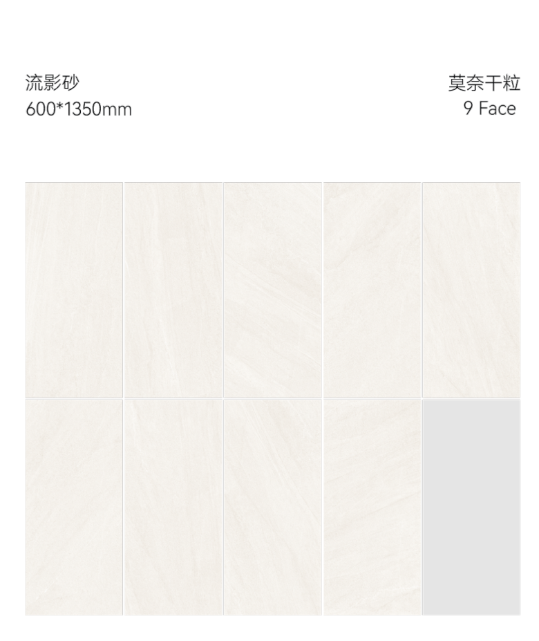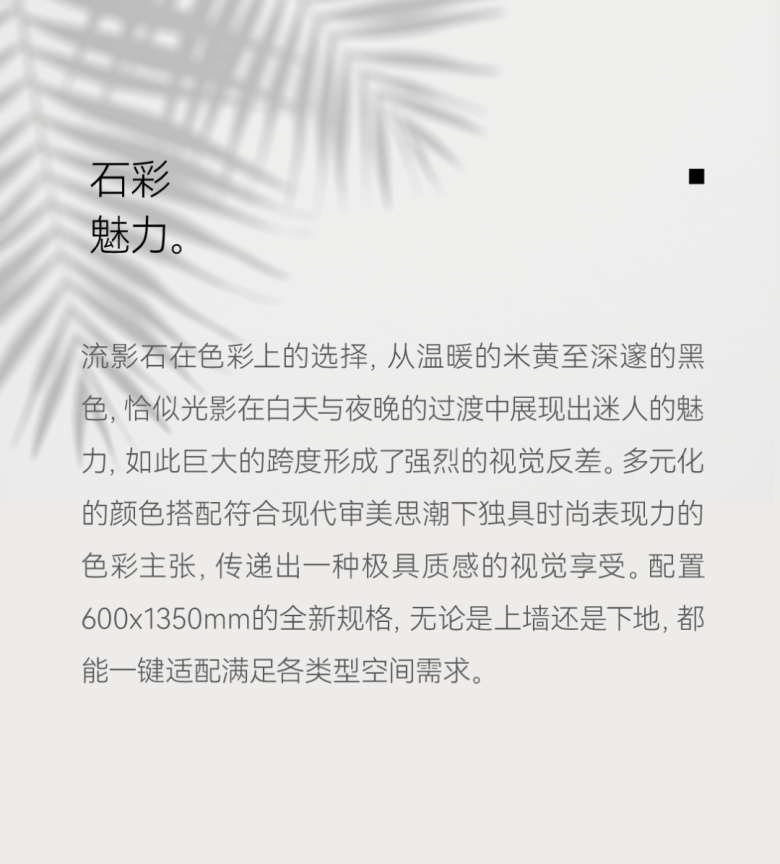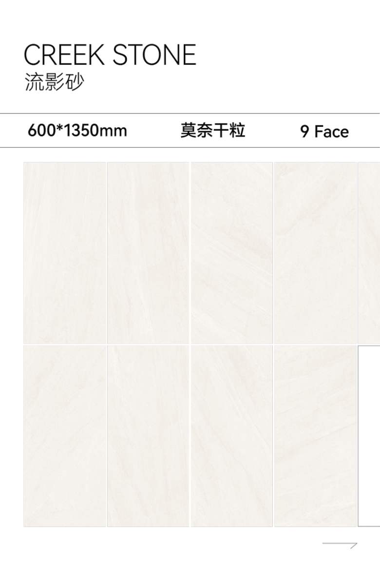 流影石在色彩上的选择,从温暖的米黄至深邃的黑色,恰似光影在白天与夜晚的过渡中展现出迷人的魅力,如此巨大的跨度形成了强烈的视觉反差。多元化的颜色搭配符合现代审美思潮下独具时尚表现力的色彩主张,传递出一种极具质感的视觉享受。配置600x1350mm的全新规格,无论是上墙还是下地,都能一键适配满足各类型空间需求。