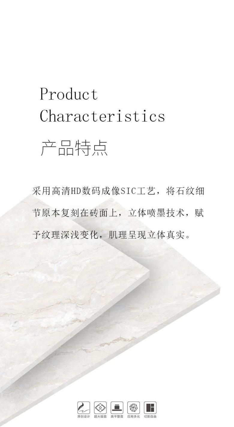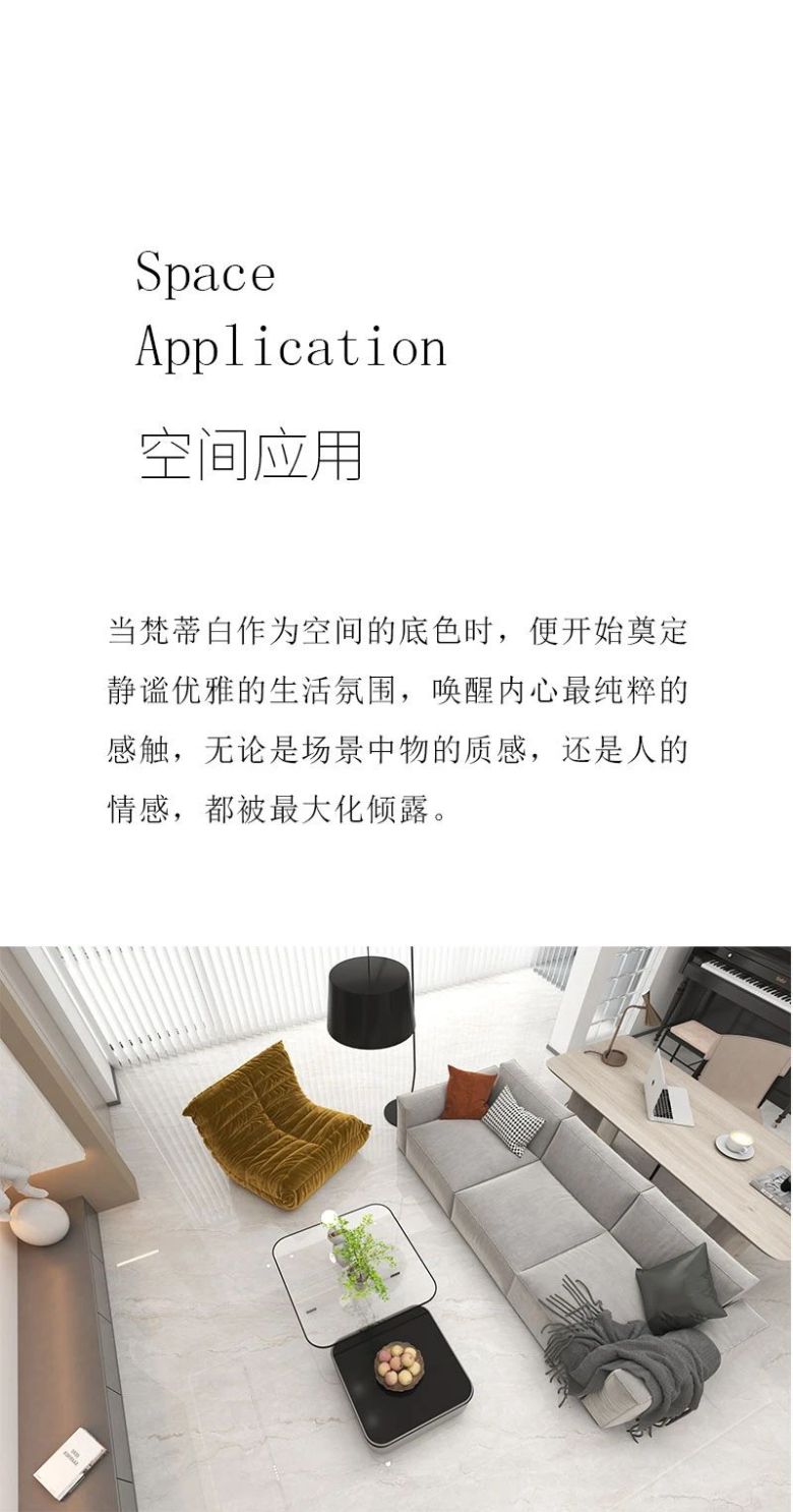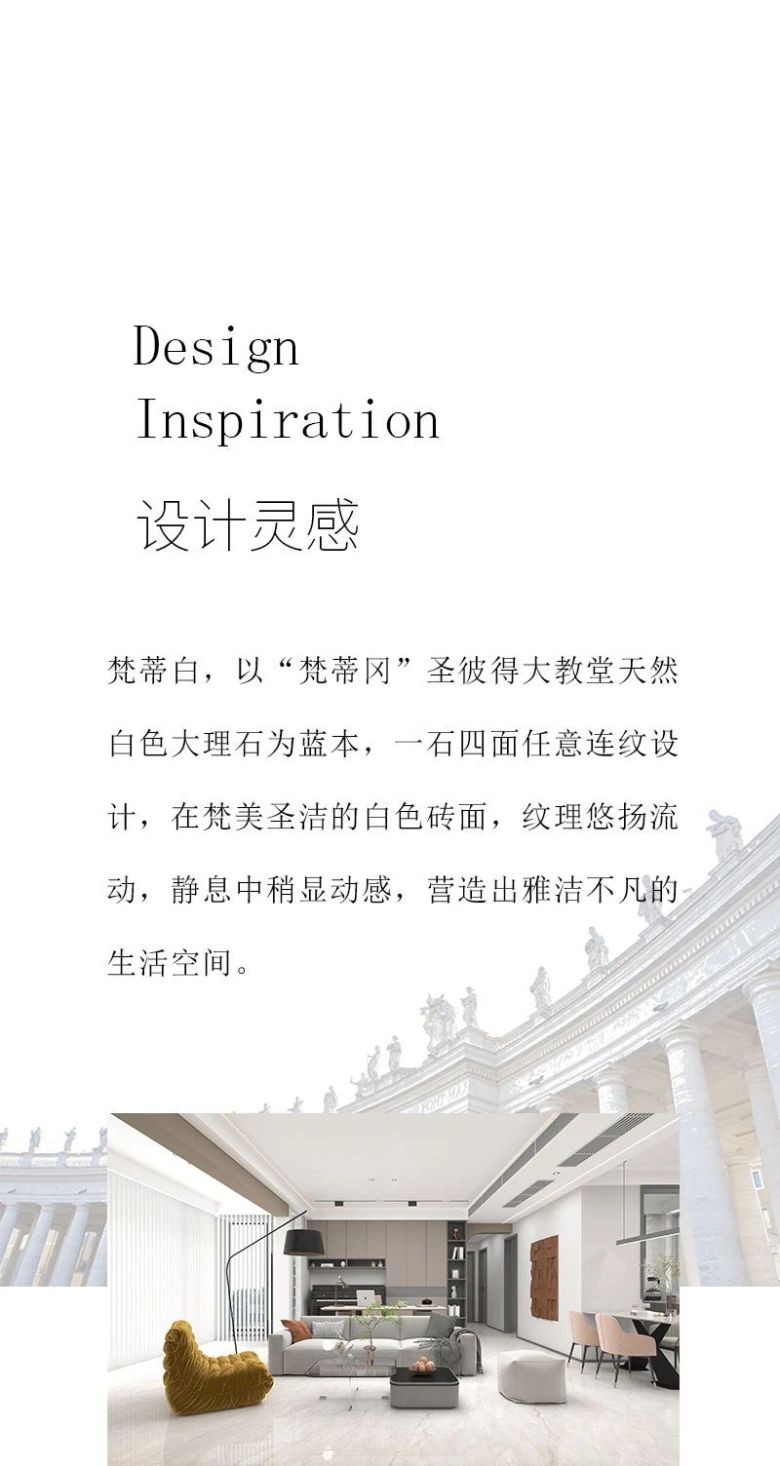 梵蒂白,以“梵蒂冈”圣彼得大教堂天然白色大理石为蓝本,一石四面任意连纹设计,在梵美圣洁的白色砖面,纹理悠扬流动,静息中稍显动感,营造出雅洁不凡的生活空间。