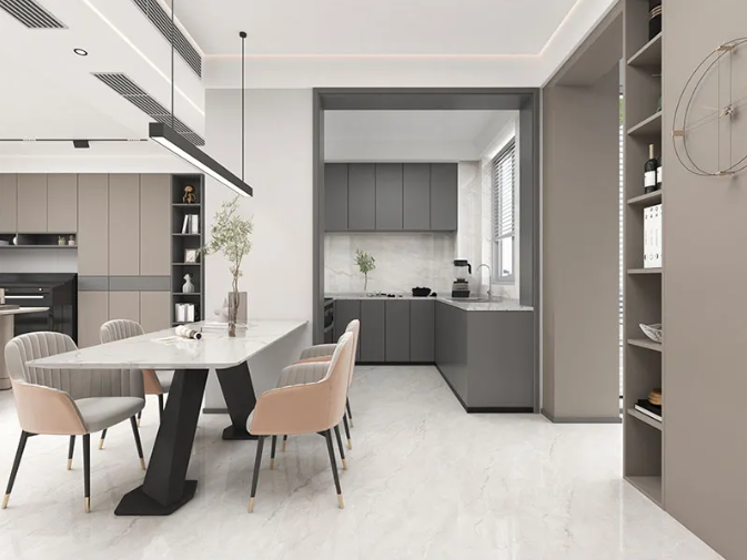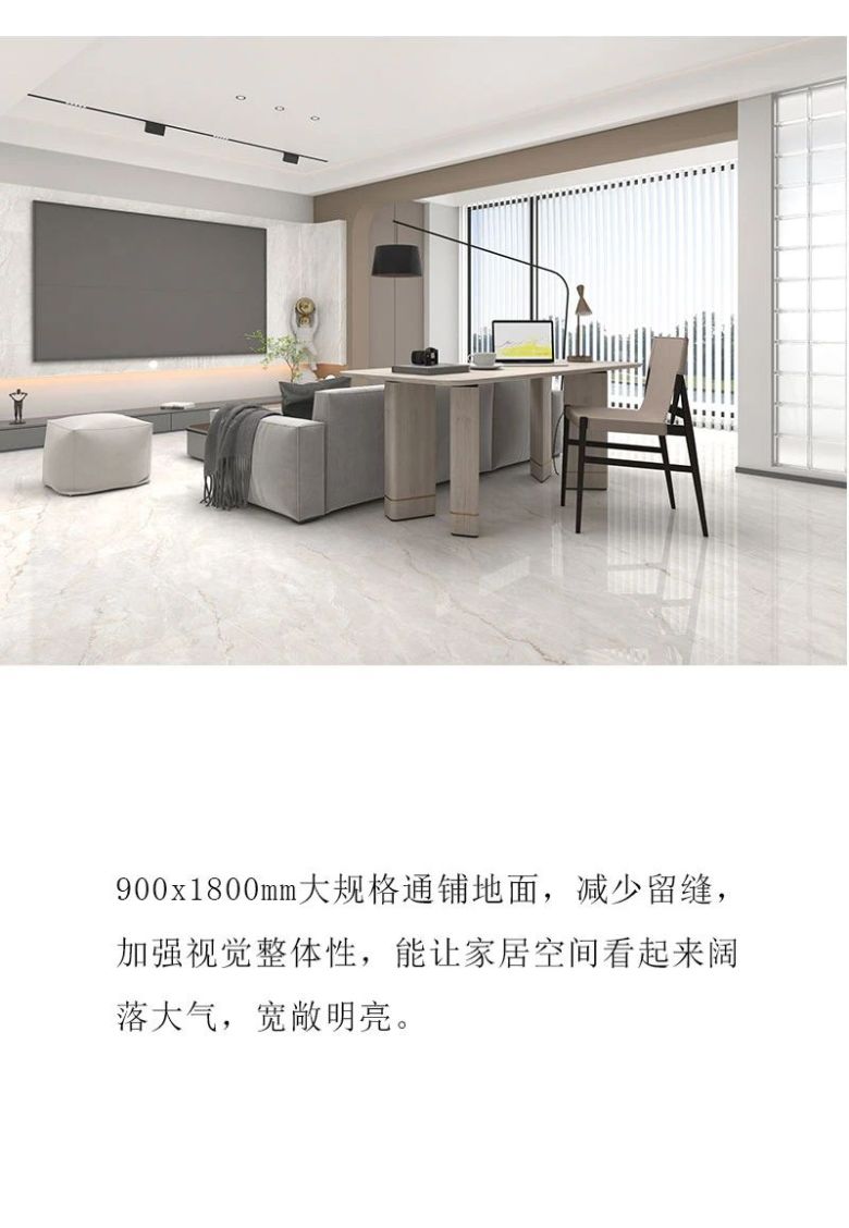 900x1800mm大规格通铺地面,减少留缝加强视觉整体性,能让家居空间看起来阔落大气,宽敞明亮。