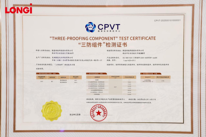 这套以“防起火”为基石的三重防护体系,经过了国家级标准的严格验证。隆基Hi-MO X10是全球首个也是目前唯一获得国家光伏质检中心(CPVT)权威“三防”认证的组件,其安全性能获得了最高级别的背书。