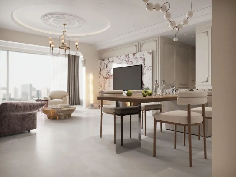 无论是背景墙和天花板的法式石膏线条,还是阳台垭口的罗马柱,亦或是空间中的弧形轮廓,建筑与装饰艺术恰到好处的点缀,皆是法式风格优雅的注脚。