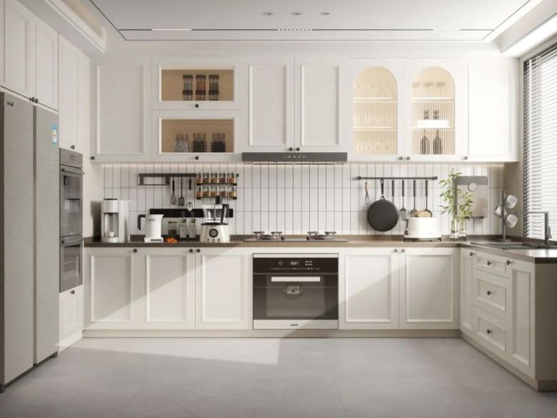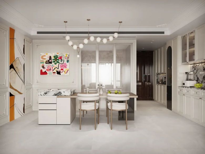 大面积的白色让空间融为一体,橱柜体延续经典法式的线框,以简洁清晰的线条,勾勒出轻盈雅致的轮廓。