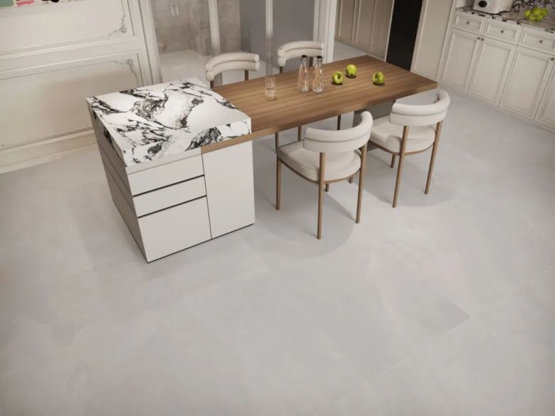 不怕花的【海贝大理石-中灰】通铺厨房地面,中灰调中和纯白空间的冷峻,与餐厅形成巧妙区隔,简约中多了几分法式古典的味道,营造出富有格调的烹饪时光。