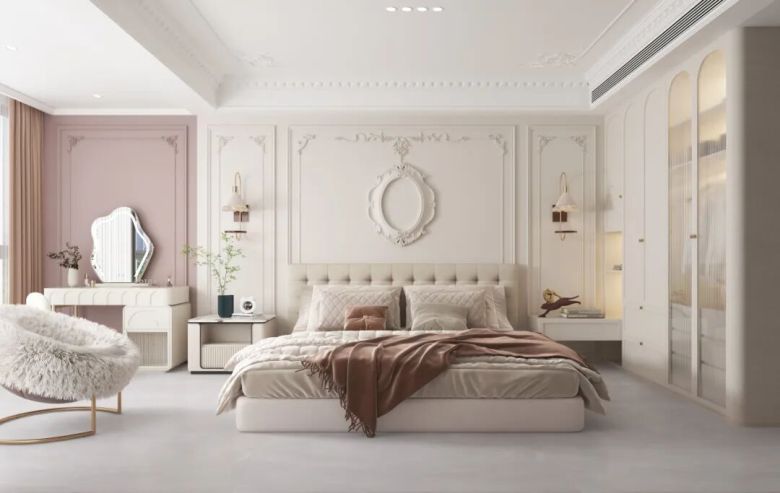 推开仪式感十足的双开门,卧室背景墙以法式PU线条雕琢柔美曲线,法式浪漫瞬间漫入。