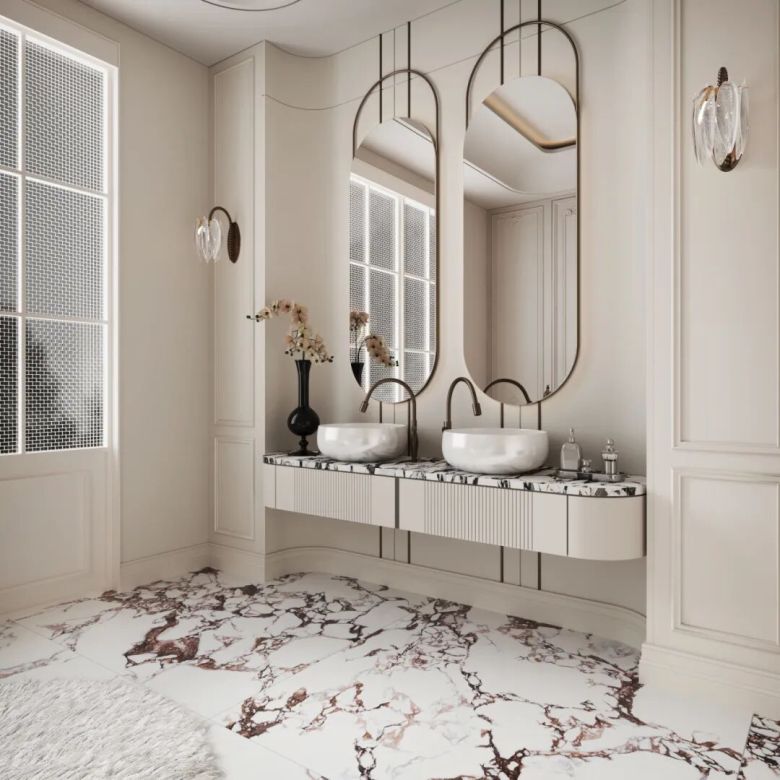 柔和灯光照耀下,【宝格丽】地面散发出迷人的奢华光泽,独特的花色和纹理,与极简金属线条镜柜形成独特张力对比。
