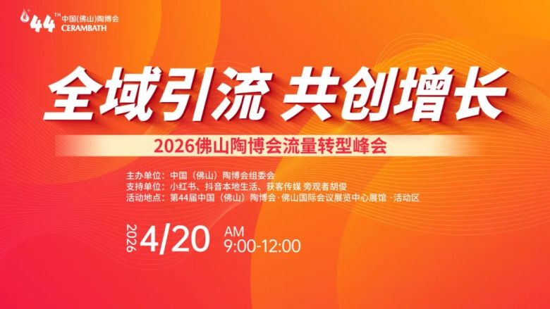 4月20日,2026佛山陶博会流量转型峰会由中国(佛山)陶博会组委会主办,获客传媒等机构大力支持,将在佛山国际会议展览中心展馆·活动区举行。本届峰会以“全域引流 共创增长”为主题,直击行业在品牌传播、渠道拓客及销售转化等方面的共性挑战,特邀抖音本地生活、小红书平台方、行业营销专家及品牌企业负责人,共同拆解流量密码,分享本地生活种草实战、内容共创案例与增长新路径,为经销商与参展企业提供可落地的高效流量解决方案。