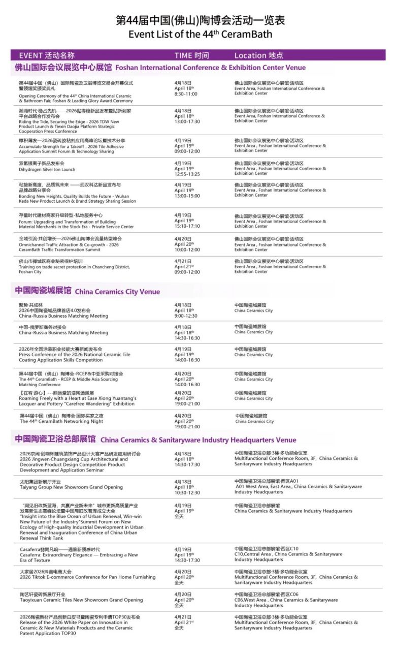 本届展会全新升级为“价值·模式·渠道·内容”四维共创平台,精准对接经销服务商、海外采购商、工程商、酒店民宿业主等核心渠道,助力参展企业品牌营销全球化。展会期间特别组织与策划RCEP&中亚采购对接会、中国-俄罗斯商务对接会、国际买家之夜、2026佛山陶博会流量转型峰会、城市更新高质量产业发展新生态高峰论坛等系列高能活动,多维度进行精准对接。同时,2026线上(佛山)陶博会(4月10-25日)同步开启,形成“展前观看-展后成交”全链路服务。