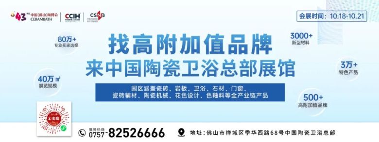 主展期:10月18-21日 开放展馆:中国陶瓷城、中国陶瓷卫浴总部、佛山国际会议展览中心 国际专场:10月22-23日 开放展馆:中国陶瓷城 ☟码上达!