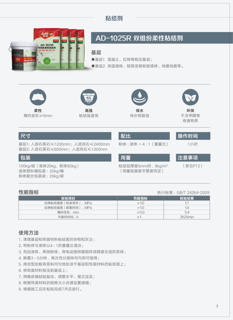 地暖地面等基层温度变化大,在短时间内会产生较大变形,若使用刚性粘结材料湿贴,特别容易发生空鼓脱落等情况。同时,目前使用大规格饰面材料的项目越来越多,大规格人造石材的应用越来越广泛,饰面材料尺寸越大,变形越大,产生的应力也越大。为此,爱迪研制AD-1025R双组份柔性粘结剂,柔性好、粘结强度高,保障工程质量。