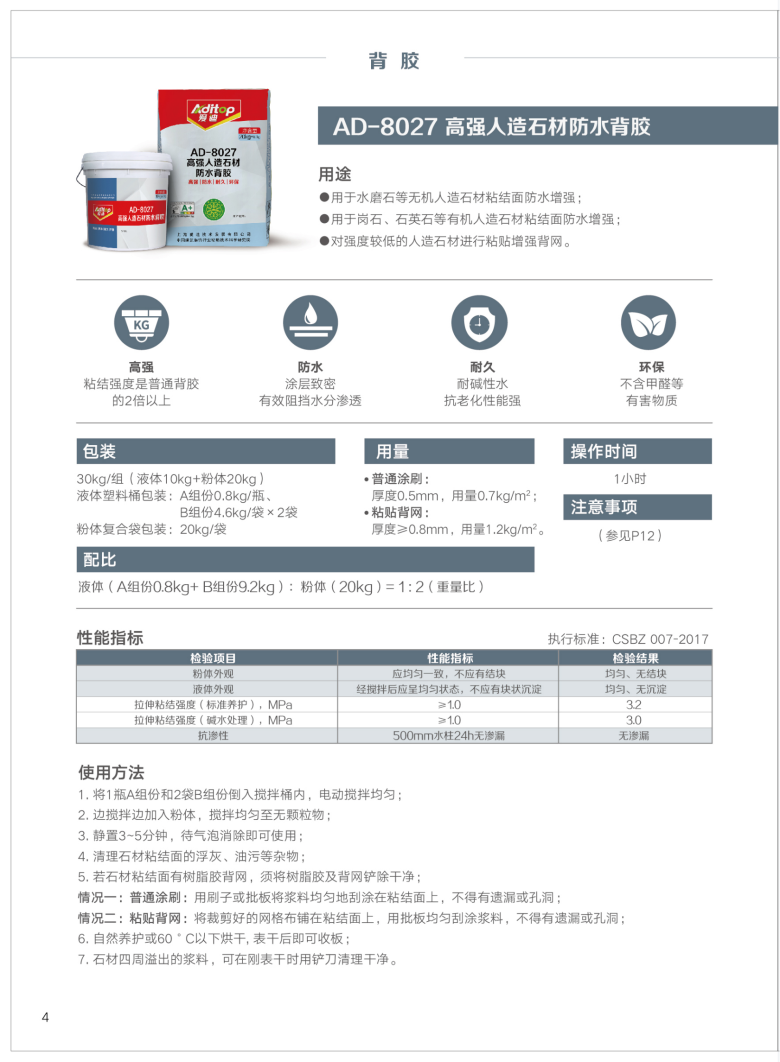 无机人造石毛细孔多、吸水率大,易发生病变,传统无机石粘贴采用半干法工艺边找平边粘贴;半干水泥砂浆水汽大,无机人造石粘贴后易吸收较多水份,出现翘曲变形和空鼓;如果在石材粘结面涂刷普通防护材料处理,则会大幅降低与水泥基胶粘剂间的相容性,也将大概率引起空鼓破坏,严重影响了无机人造石的普及应用。为提升无机人造石粘结面防水性能,提高无机人造石与胶粘剂间粘结强度,爱迪研发了AD-8027无机人造石材防水背胶,用于无机人造石粘结面处理后,可阻挡水汽从粘结面渗入人造石,预防无机人造石材病变发生。