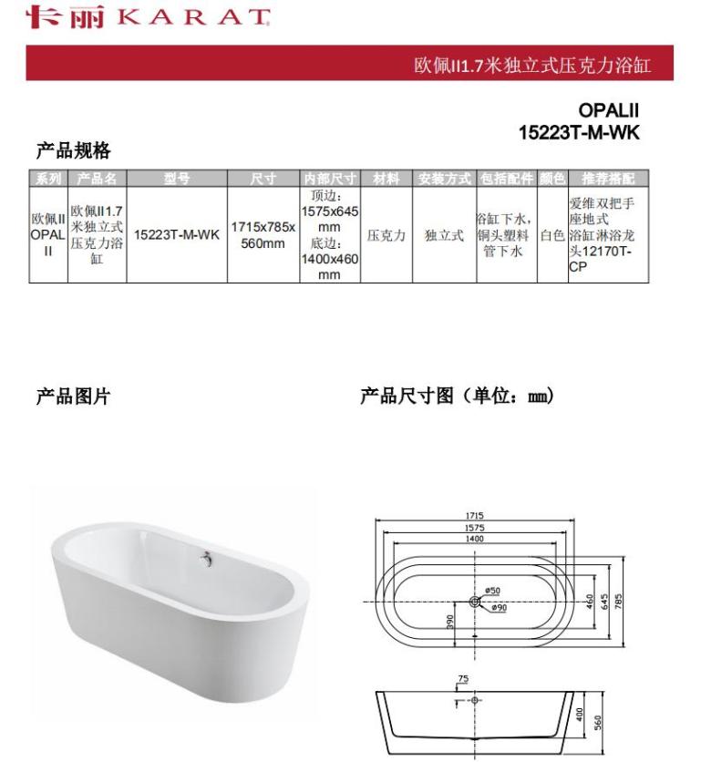 OPALII 欧佩II 1.7米独立式压克力浴缸