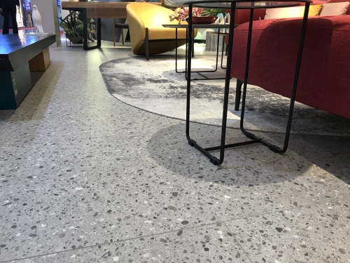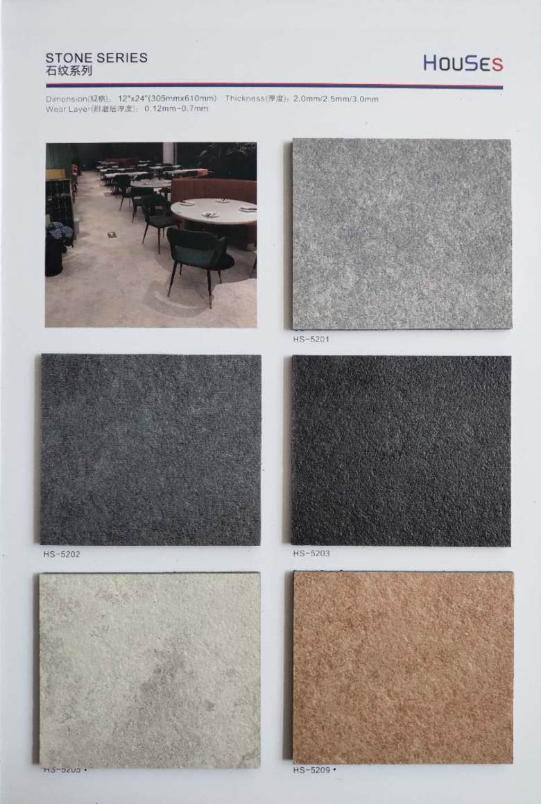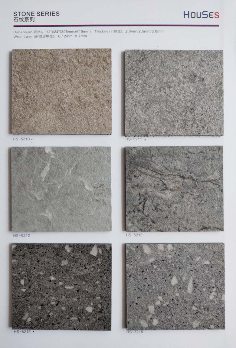 该类地板为塑胶地板的一种,行业内俗称“石塑地板”。产品的基本材质为树脂粉和石粉的聚合物,产品的显著特点是防水性能良好,环保系数高;同时拥有阻燃防火、吸音降噪、承重防滑、适用地暖、铺设简单等优势。在学校、商场、办公、展览展示等领域得到广泛应用。
