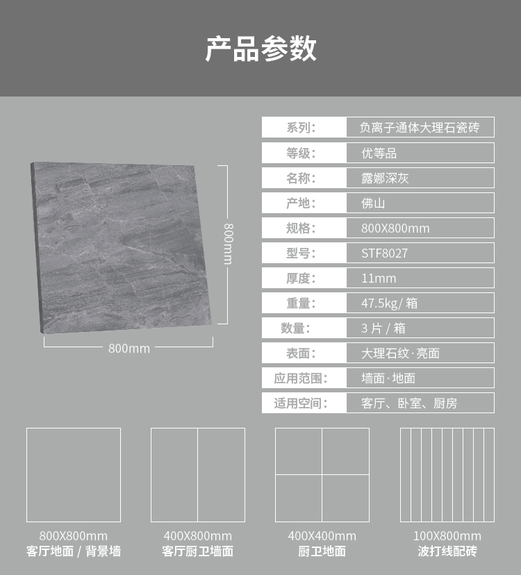 盛世名嘉瓷砖 负离子通体大理石瓷砖 800x800 露娜深灰