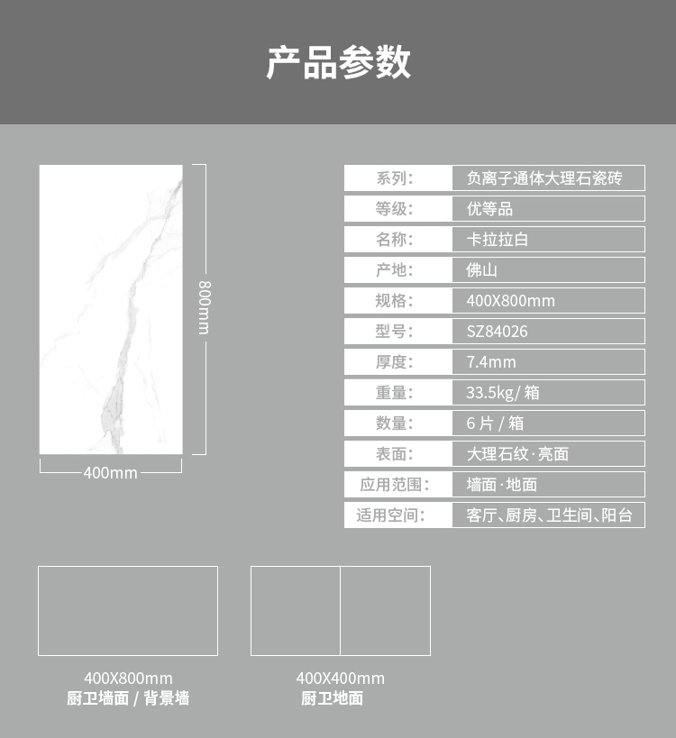 盛世名嘉瓷砖 负离子通体大理石瓷砖 400x800 卡拉卡白