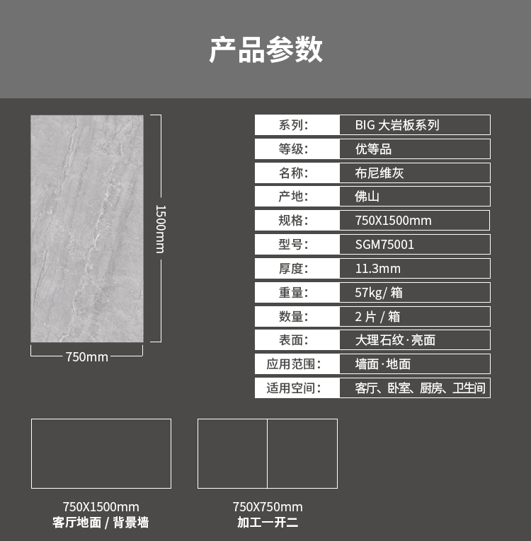 盛世名嘉瓷砖 BIG大岩板系列 750x1500mm 布尼维灰