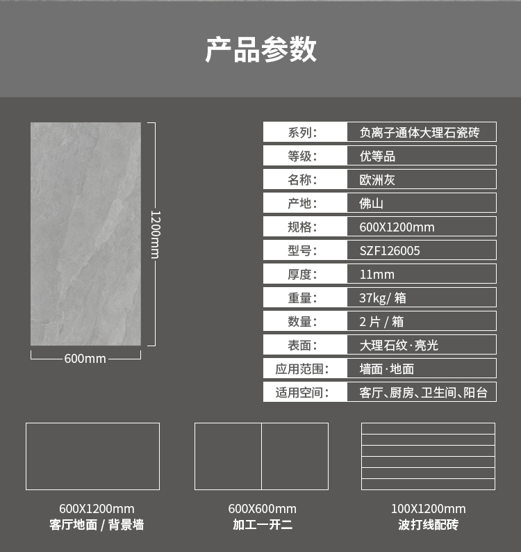 盛世名嘉瓷砖 负离子通体大理石瓷砖 600x1200 欧洲灰