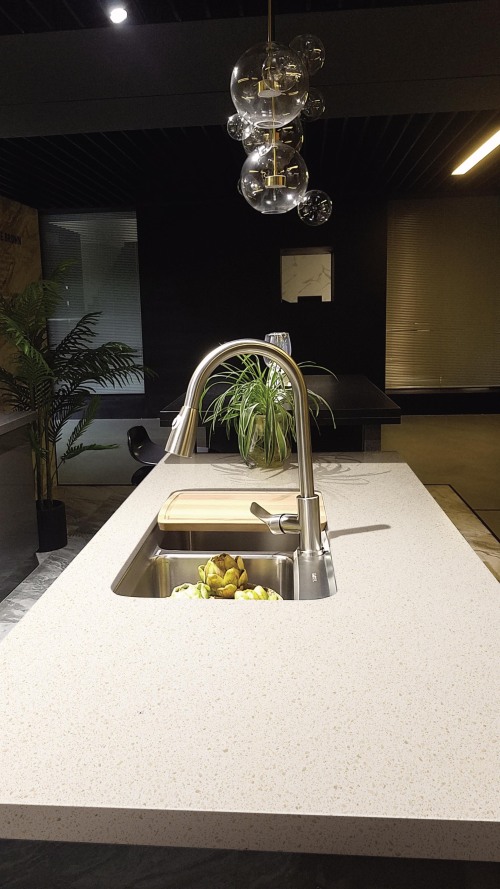 荣冠石英石是在真空高压条件下制造的表里如一致密无孔的复合材料,对酸碱等有极好的抗腐蚀能力,长久使用,简单清洗,亮丽如新;