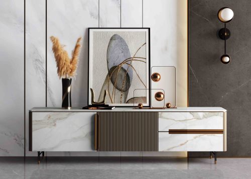铿锵有力的纹理游走在雪白透亮的雪原上,由粗到细,由远到近,仿佛俯瞰山河,错落有致,使空间呈现大气但不张扬,简约却不失韵味。